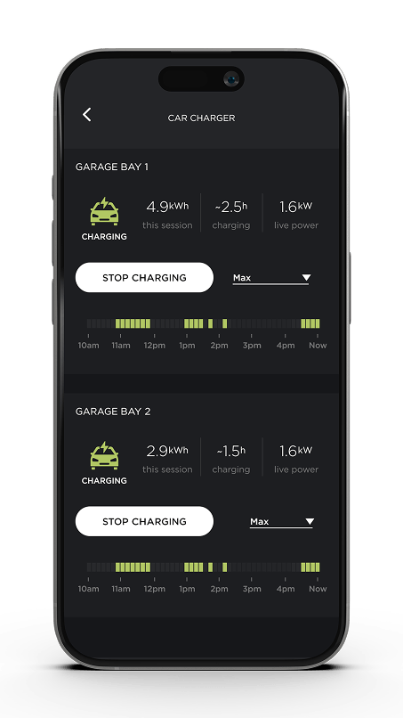 Easily manage the charging sessions of multiple vehicles with the intuitive EV widget, allowing you to coordinate and monitor each session. You can set the maximum charge rate to stay within your energy budget, or set a charging schedule ensuring efficient use of available power.